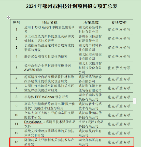 近日,鄂州市科學(xué)技術(shù)局正式發(fā)布了《2024年鄂州市科技計劃項目擬立項項目公示》。我司以自主研發(fā)的“降脂功效大豆肽制備關(guān)鍵技術(shù)與產(chǎn)品開發(fā)”項目榮獲重點研發(fā)專項。